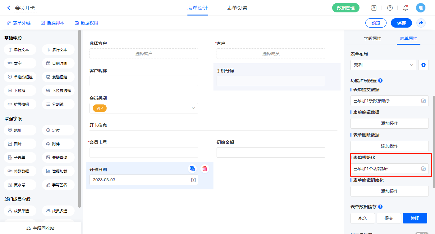 【会员开卡】的菜单栏,操作模式设置为弹出表单【会员开卡】;