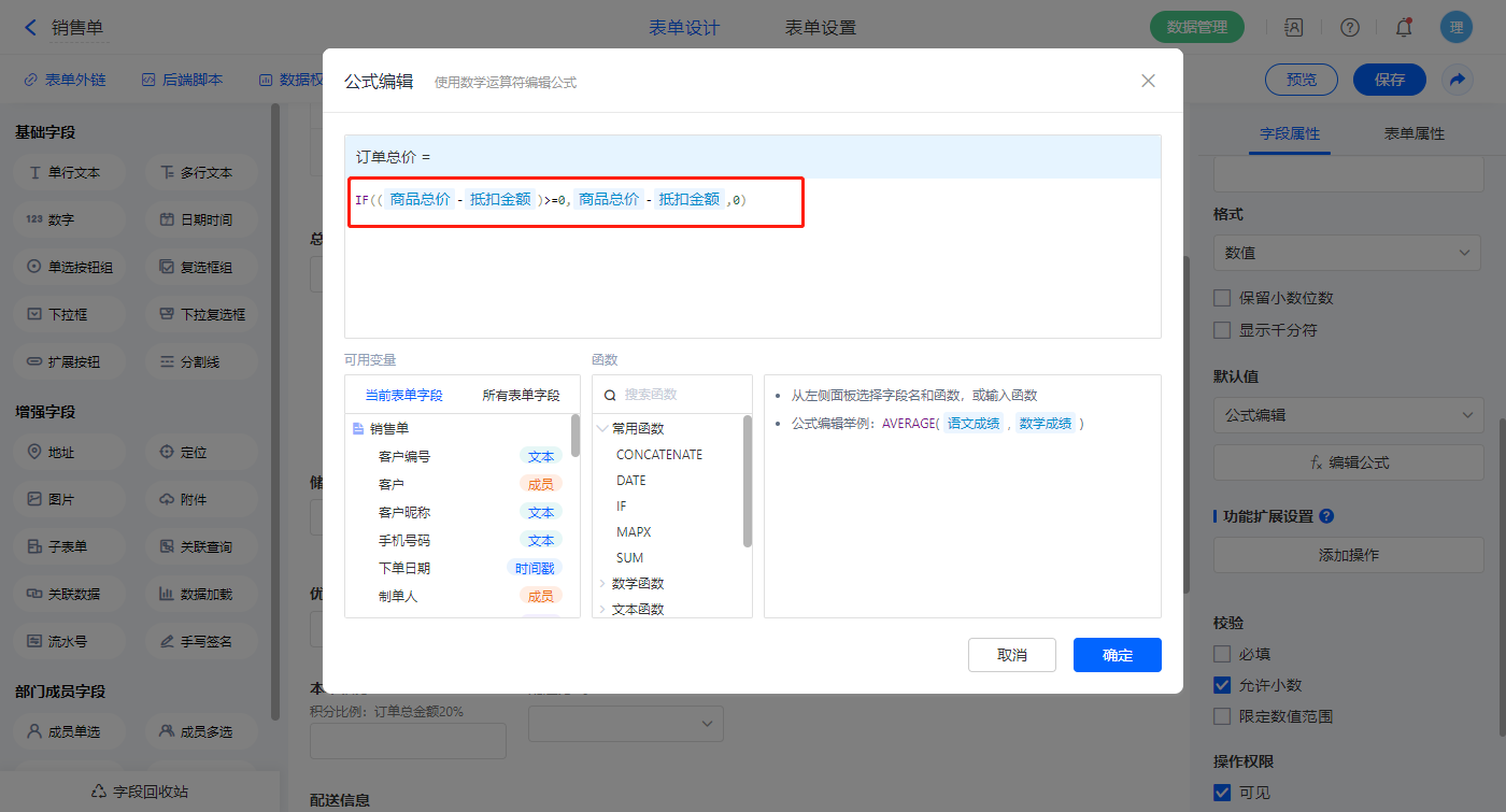 【抵扣金额】字段,设置默认值为公式编辑,如图设置公式;