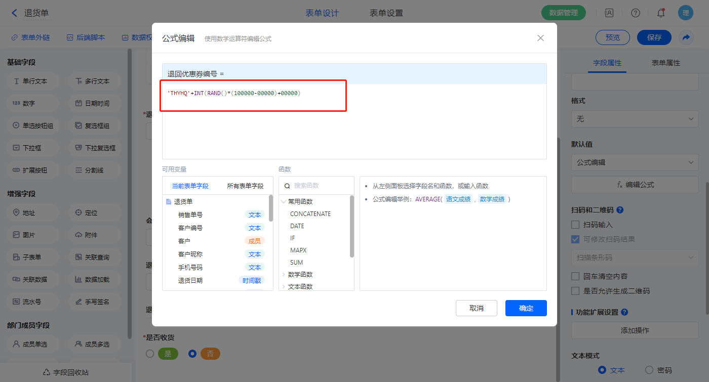 【退回优惠券编号】字段,设置默认值为公式编辑,如图设置公式;