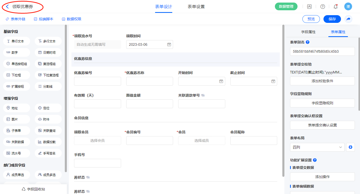 1)新增【优惠券】报表,用基础报表【数据表】展示数据源为表单【优惠券】的数据;