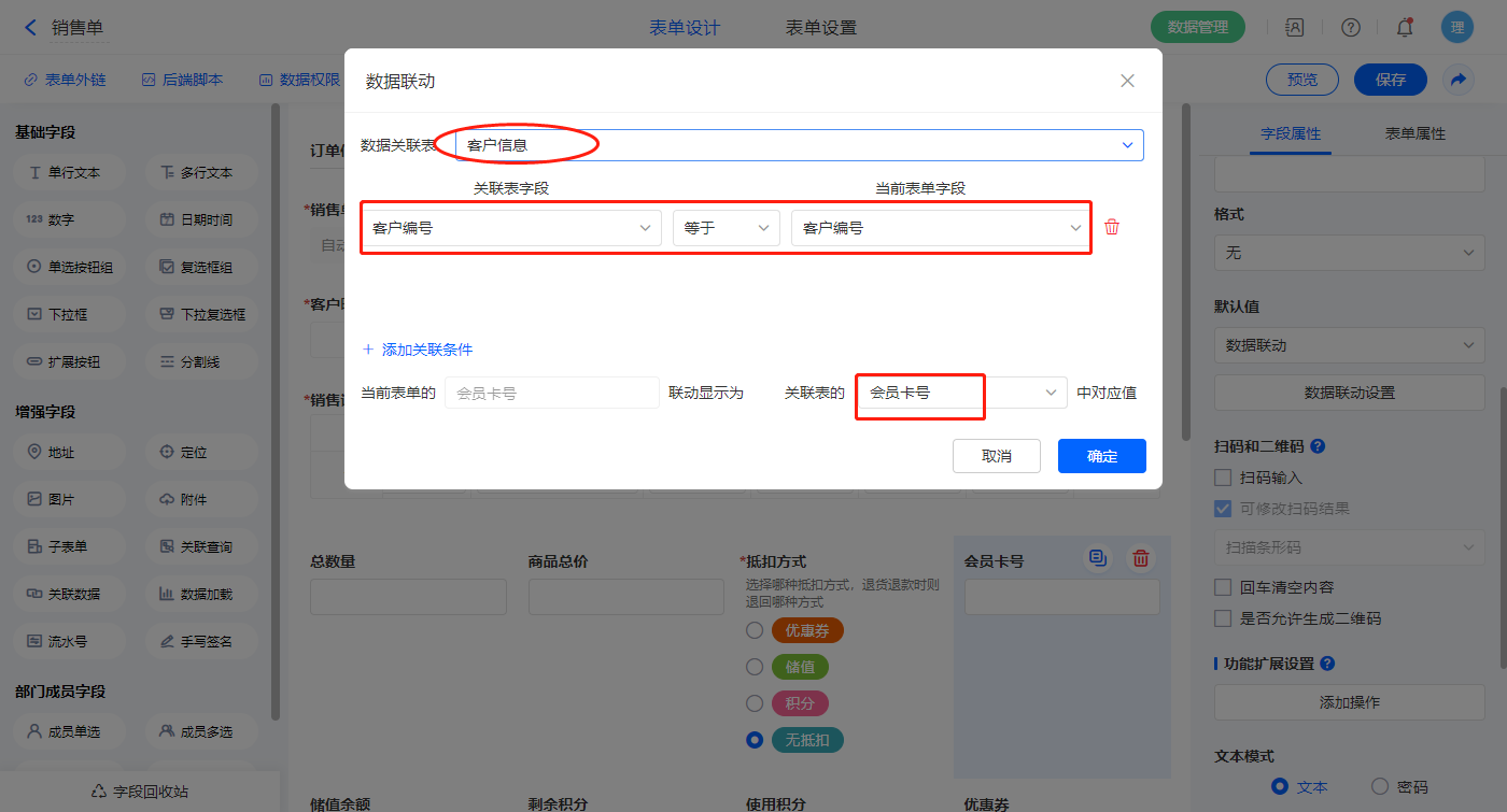 【会员卡号】字段,设置默认值为数据联动,设置联动条件及联动字段;