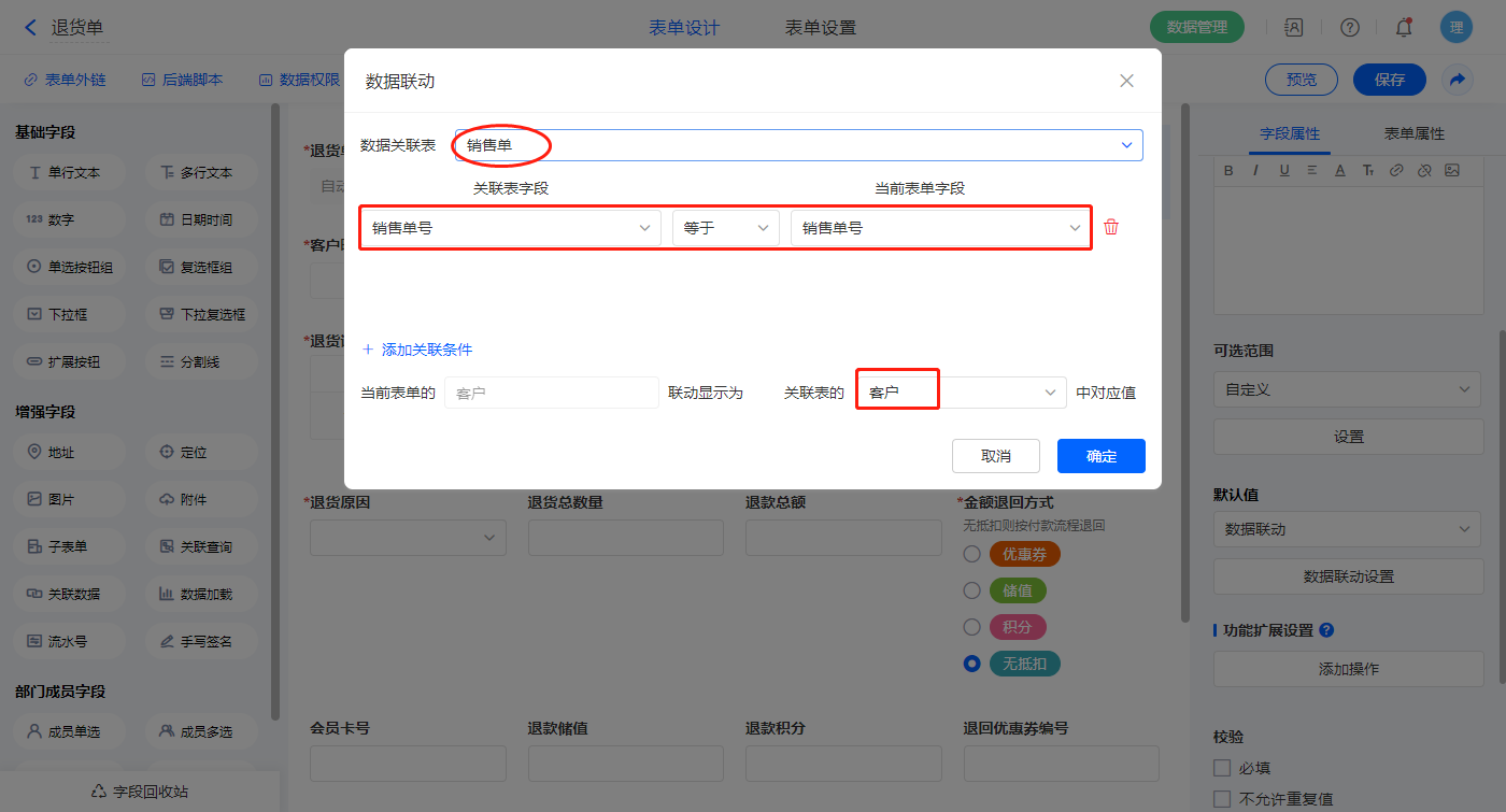 2)【客户编号】字段,设置默认值为数据联动,设置联动条件及联动字段;