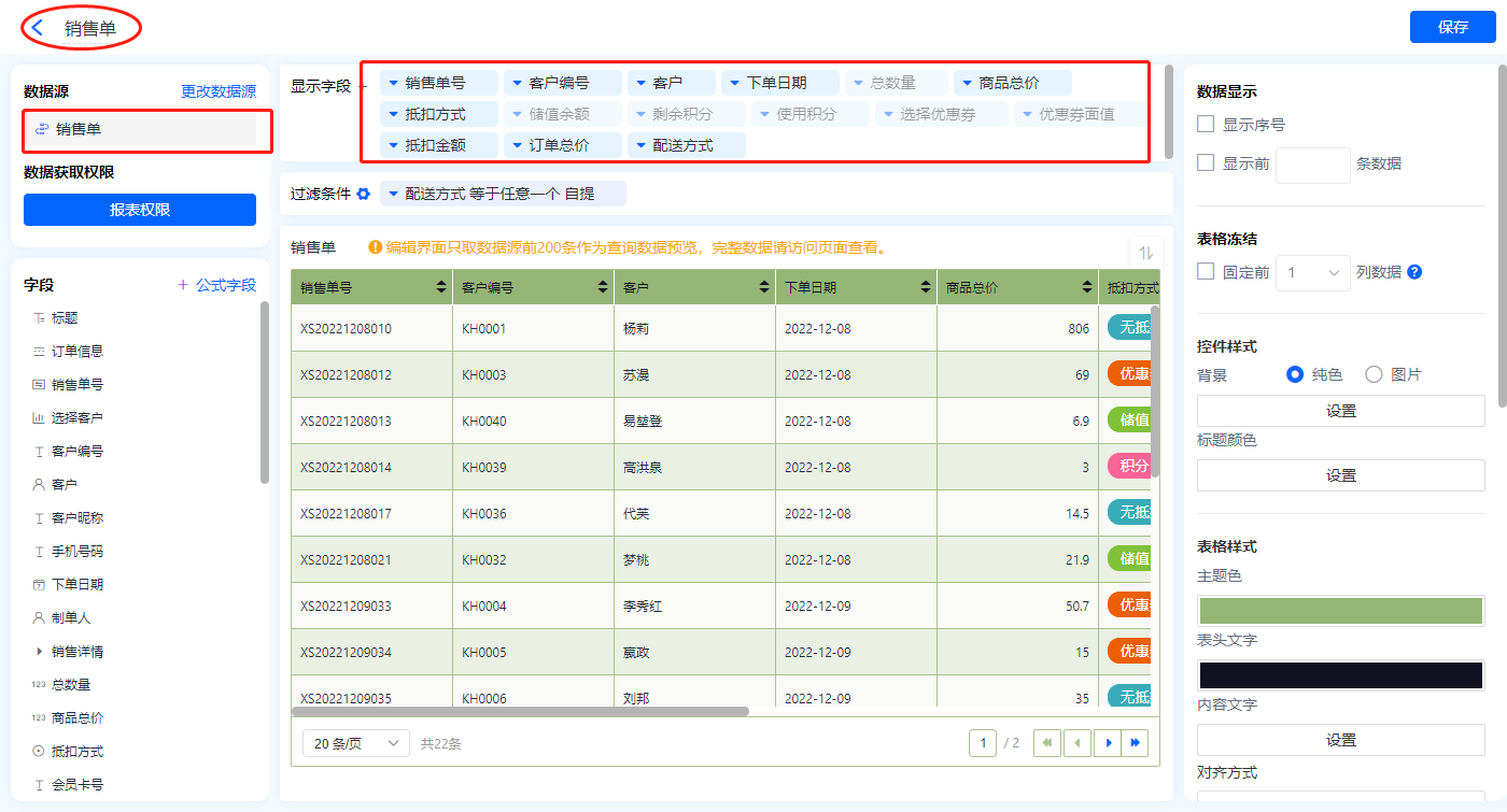 1)新增【自提销售单】报表,用基础报表【数据表】展示数据源为表单【销售单】的数据;