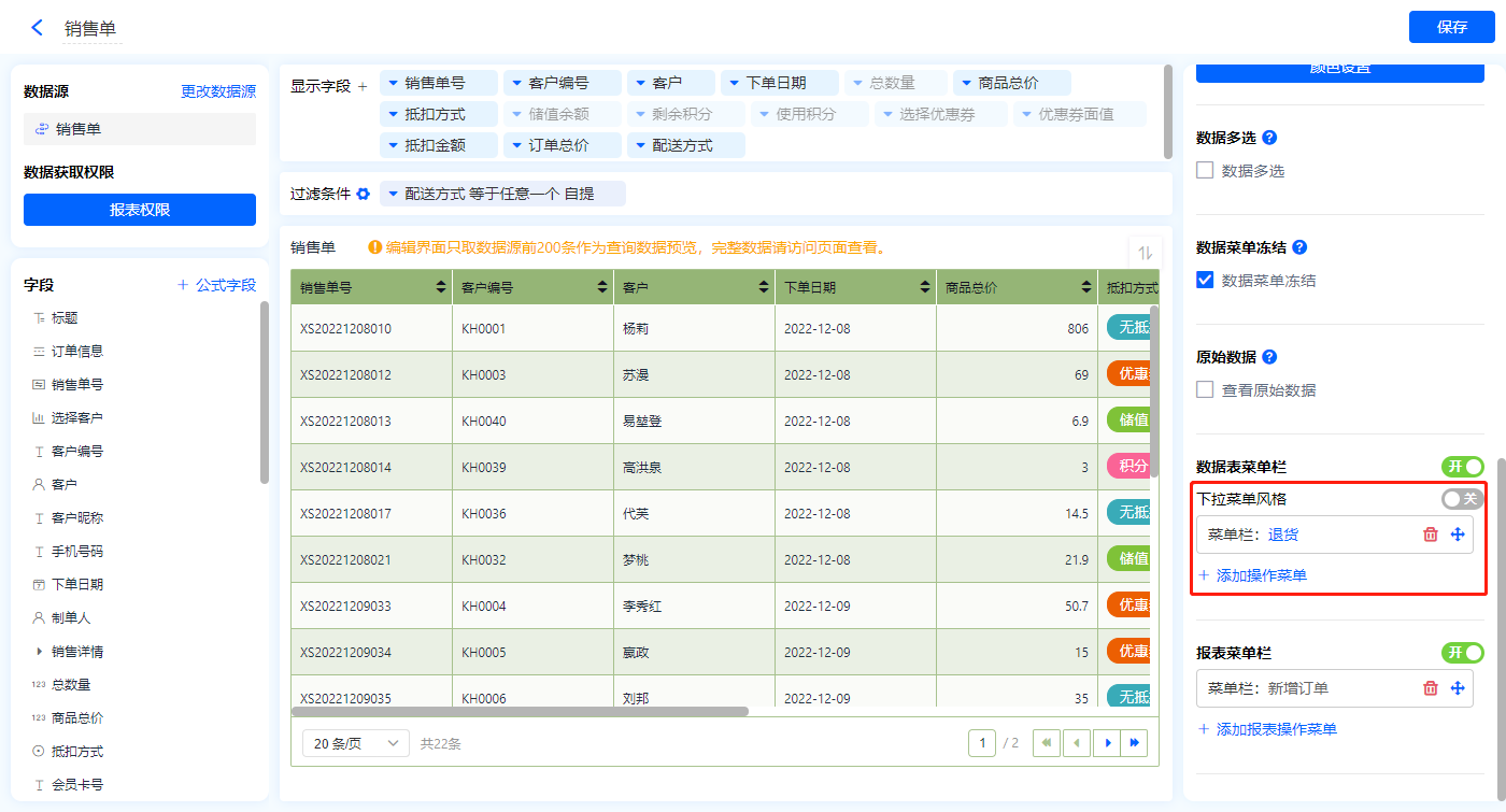 1)参照2.8、【自提销售单】表单的搭建方式,变更数据表的过滤条件为【配送方式】等于商家配送;