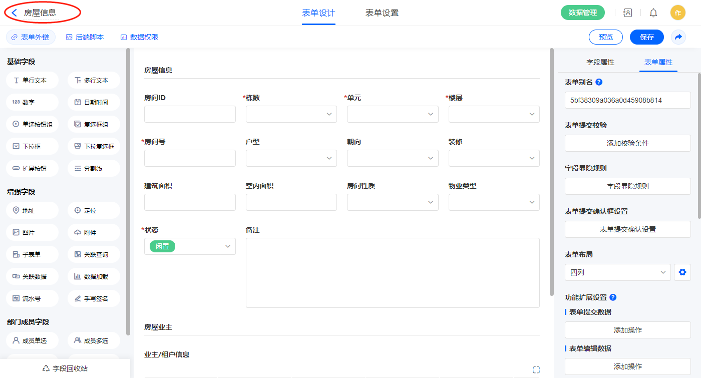 2.4、表单【房屋信息】字段及表单属性设置