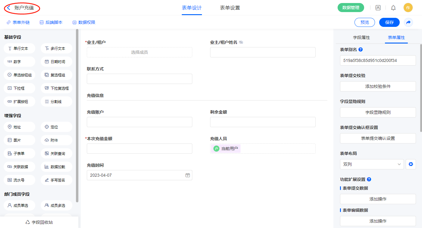 6)新增表单【账户充值】,字段设置如下;