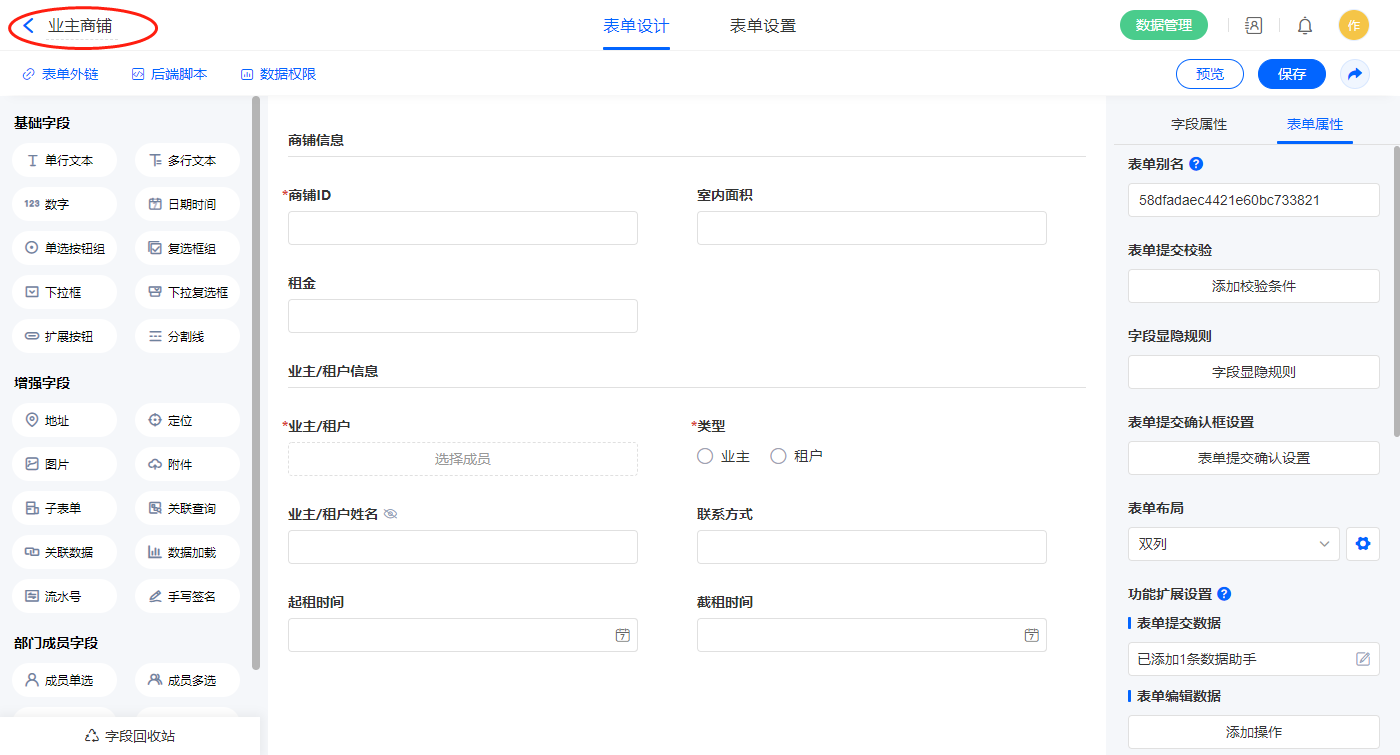 2.7、表单【业主商铺】字段及表单属性设置