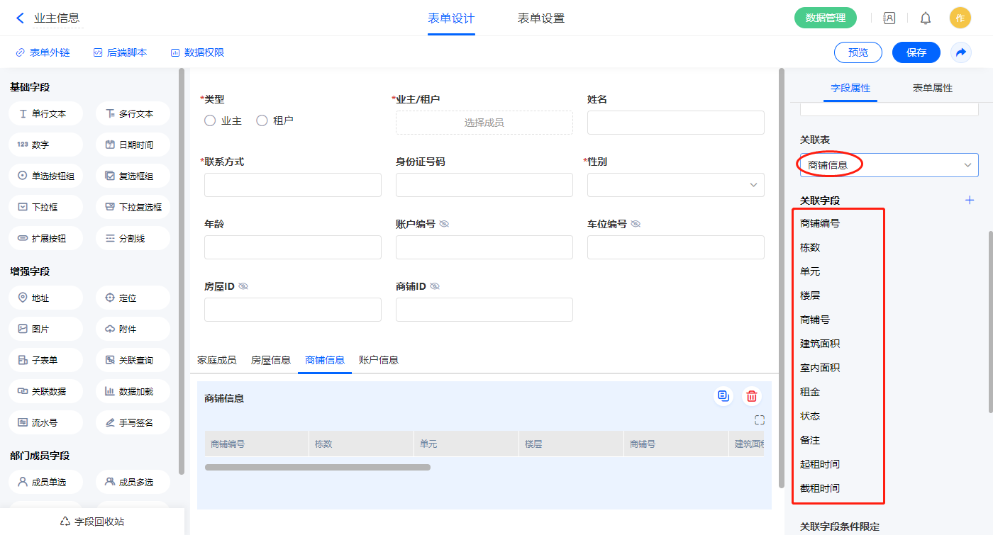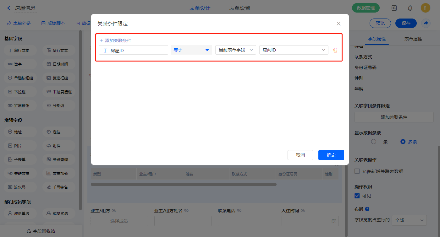 2)【业主/租户信息】关联查询字段,设置关联表为【业主信息】并如图选择关联字段,设置显示数据条数为多条;