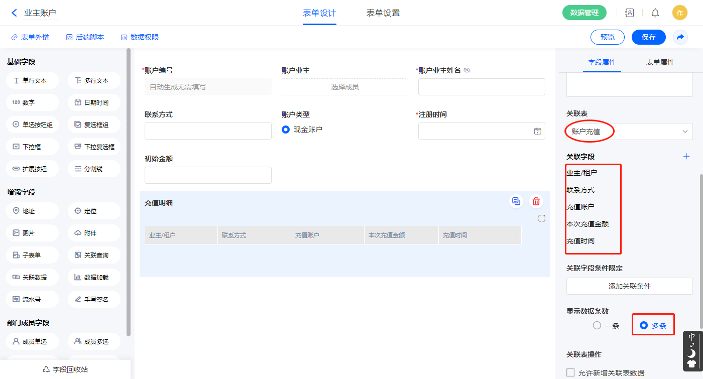2)【充值明细】关联查询字段,设置关联表为【账户充值】并如图选择关联字段,设置显示数据条数为多条;