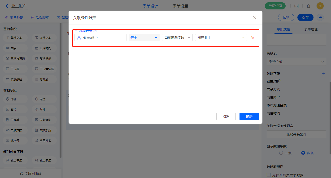 设置关联条件,【业主/租户】字段作为关联条件;