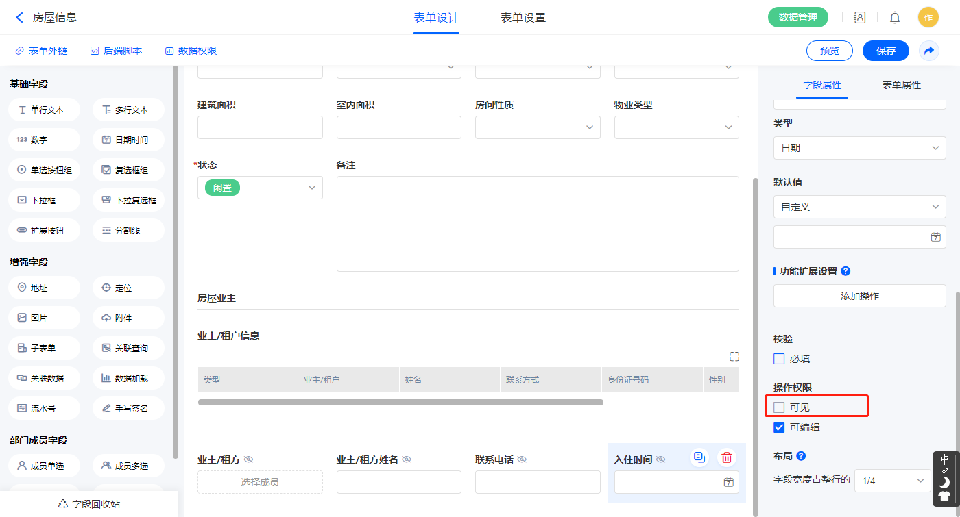 1)【业主/租户姓名】字段,默认值选择公式编辑,如图设置公式并权限设置不可见;