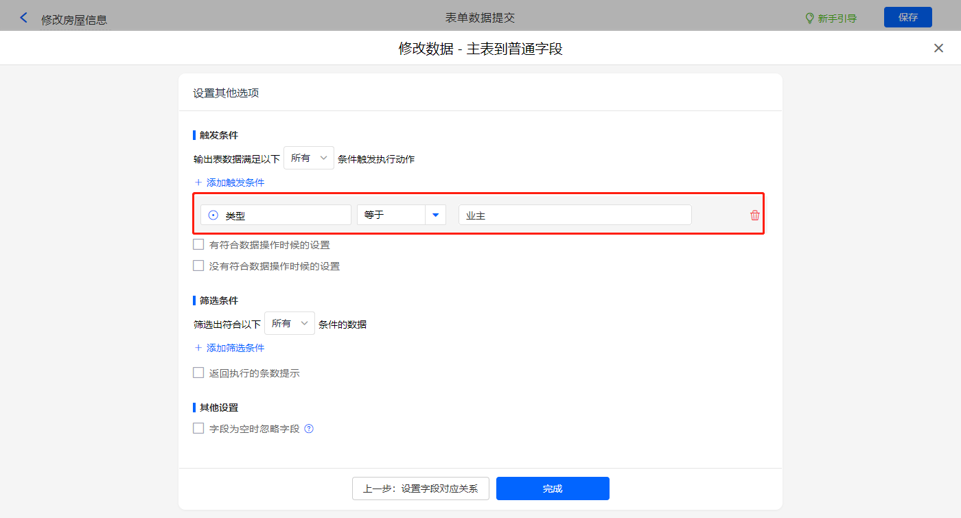 其他设置触发条件为【类型】等于业主,设置好点击【完成】并保存该数据助手;