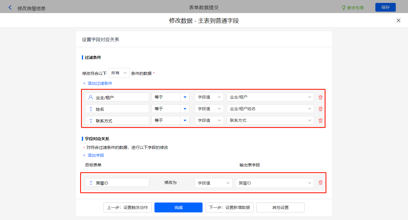 新增修改数据的执行动作,选择目标表单【业主信息】,配置过滤条件及对应赋值字段,设置好点击【完成】并保存该数据助手;