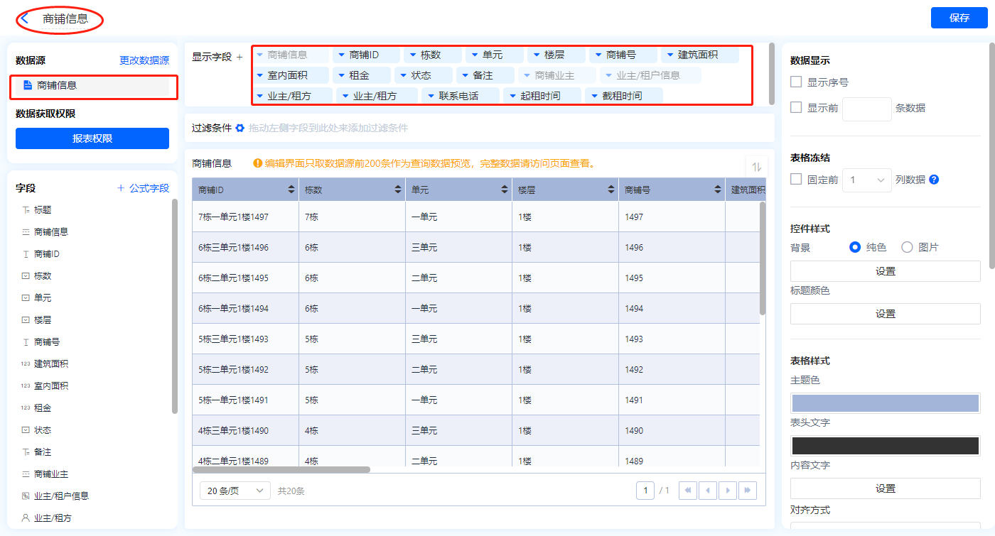 1)新增【商铺管理】报表,用基础报表【数据表】展示数据源为聚合表【商铺信息】的数据;