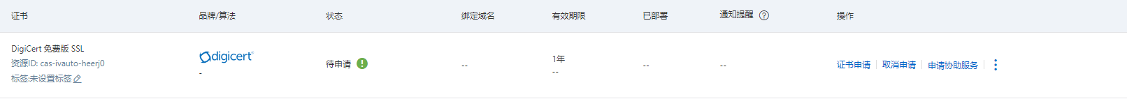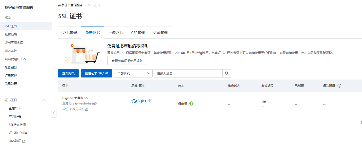 成功创建证书后,证书列表中将生成一个免费证书。