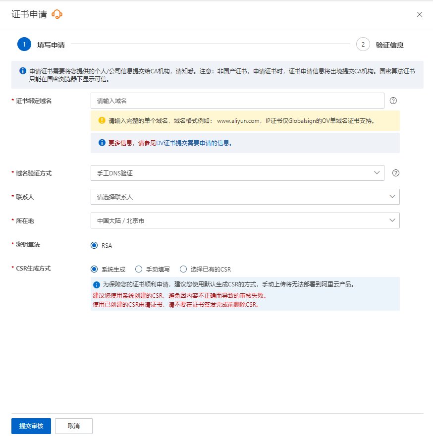 8、在证书申请面板,配置申请信息,并单击提交审核。