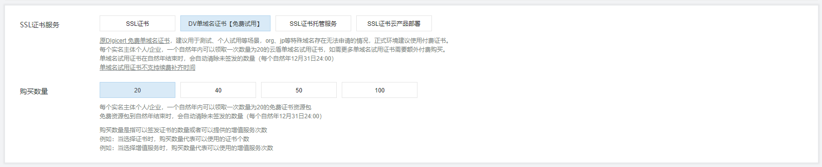 创建证书按钮中的数字表示剩余可申请的免费证书个数/总共可申请的免费证书个数。只有当剩余可申请的免费证书个数不为0时,您才可以创建证书。如果剩余可申请的免费证书个数为0,建议您单击立即购买,获取可用的免费证书个数。