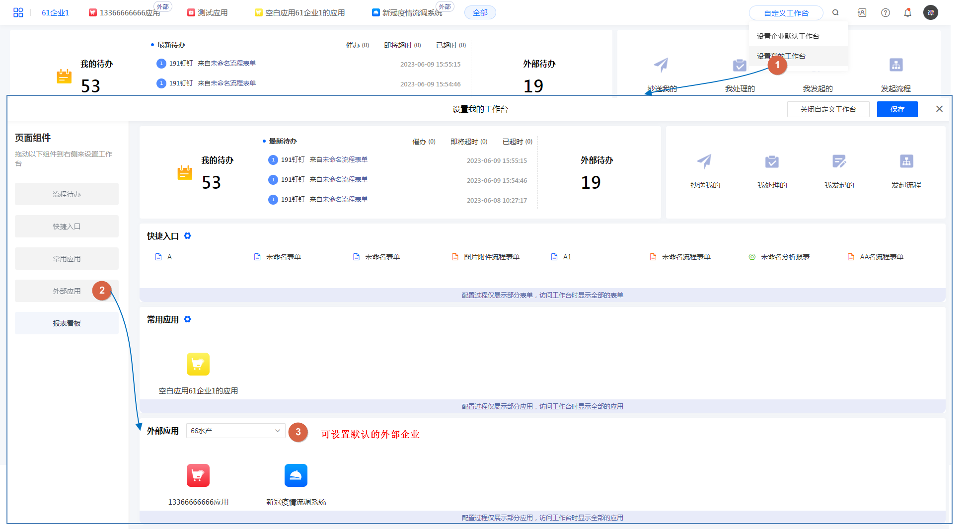 工作台->自定义工作台->设置我的工作台->左侧拖动外部应用到右侧面板->保存。