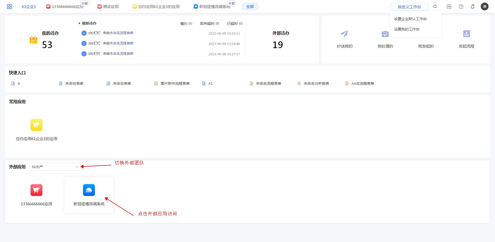 当前团队作为其他团队的互联企业,为了方面快捷的访问快捷应用,对接人可以设计我的工作台,添加外部应用板块,效果如下:
