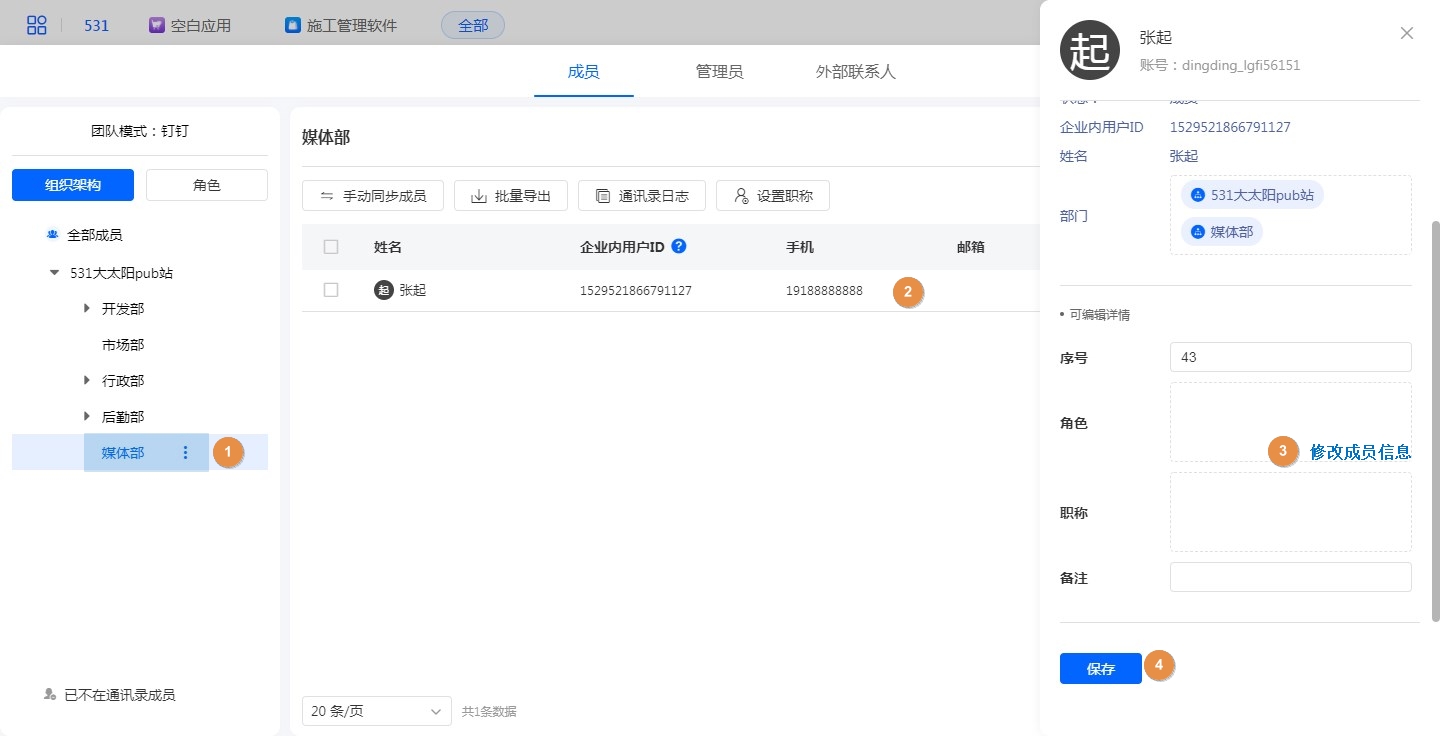 在通讯录中,点击任意成员,会弹出成员信息面板,其中手机、邮箱、userid、状态、企业内成员ID、姓名、部门为钉钉通讯录信息,如果需要修改需要在钉钉通讯录中修改。