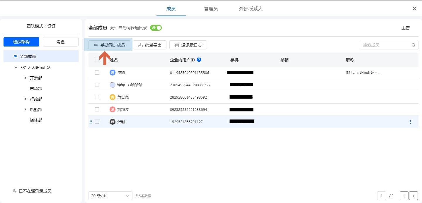 关闭自动同步功能后,可在钉钉通讯录中修改成员信息后,点击手动同步成员按钮进行组织架构的同步操作。