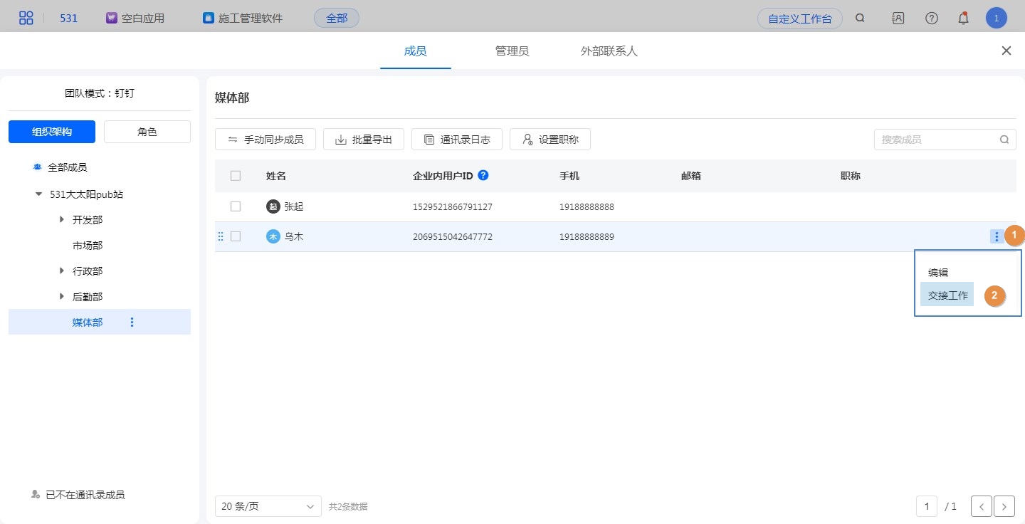 当成员的工作变动或者即将离职,可以将工作交接给其他负责人,详情见交接工作。