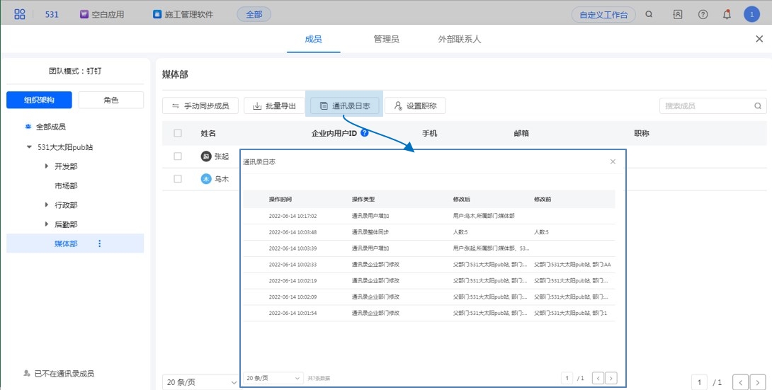 在钉钉管理后台操作组织架构及成员信息时,人员同步至通讯录再同步到表单通讯录中