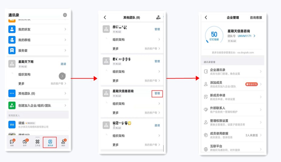 【手机钉钉】-【通讯录】-【找到团队】-【管理】,在此页面中展示了各个功能的入口,如企业通讯录管理、添加成员等。