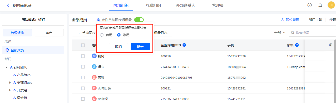 - 停用:同步后,成员默认停用。可见范围内的所有组织架构及成员均同步至通讯录。对于需要使用的成员,需手动启用后方可启用。