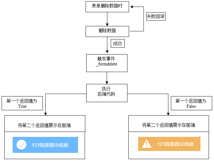 触发事件后,前端页面会将"当前表单别名","表单数据信息","数据提交类型"传给后端对应的云应用中的"_formdelete"函数,然后执行"后端代码"并返回"返回结果"和"需要界面展示的数据"。