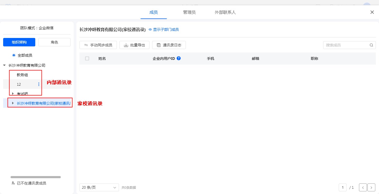 家校通讯录的手动同步和自动同步和内部通讯录同步方式一致,当组织架构或者成员信息变更时,会同步到系统通讯录中。