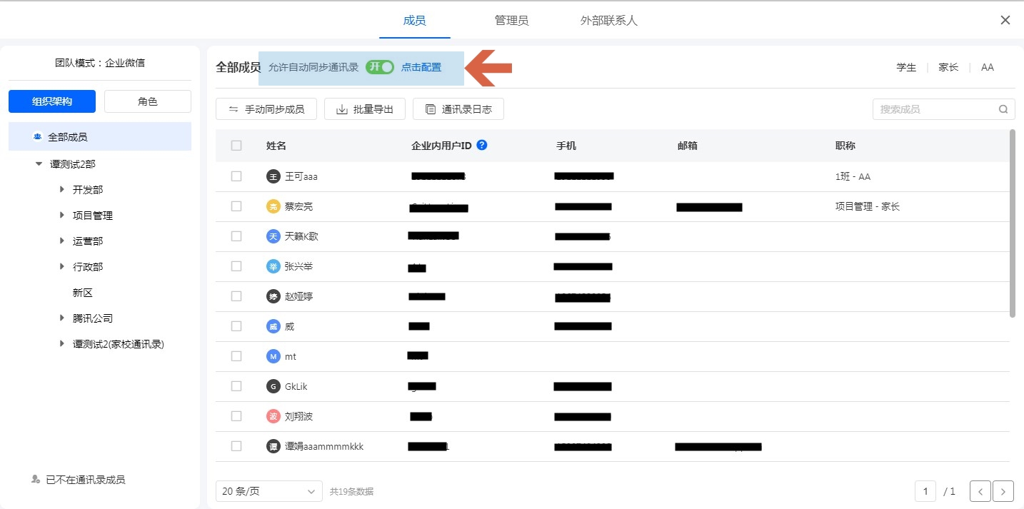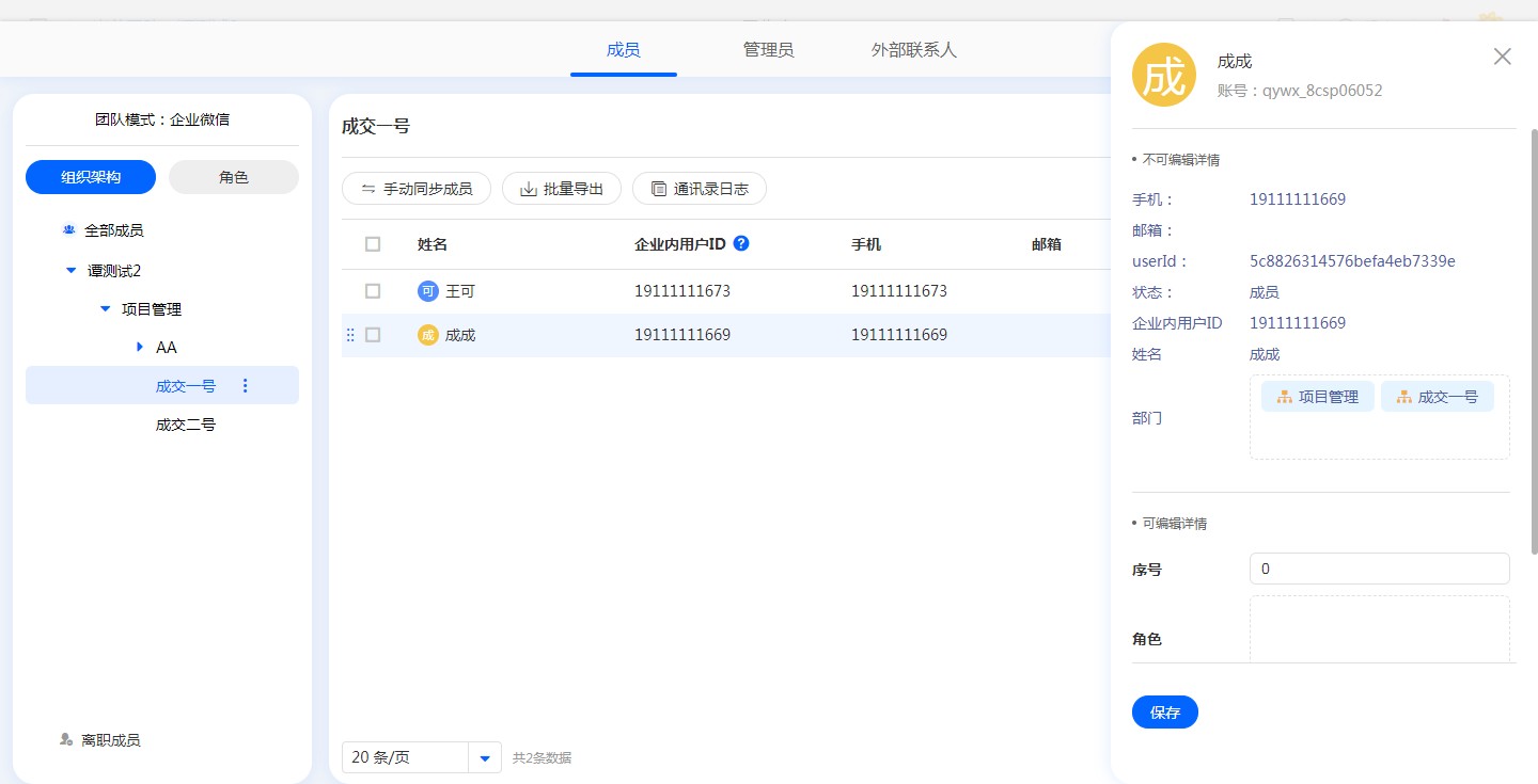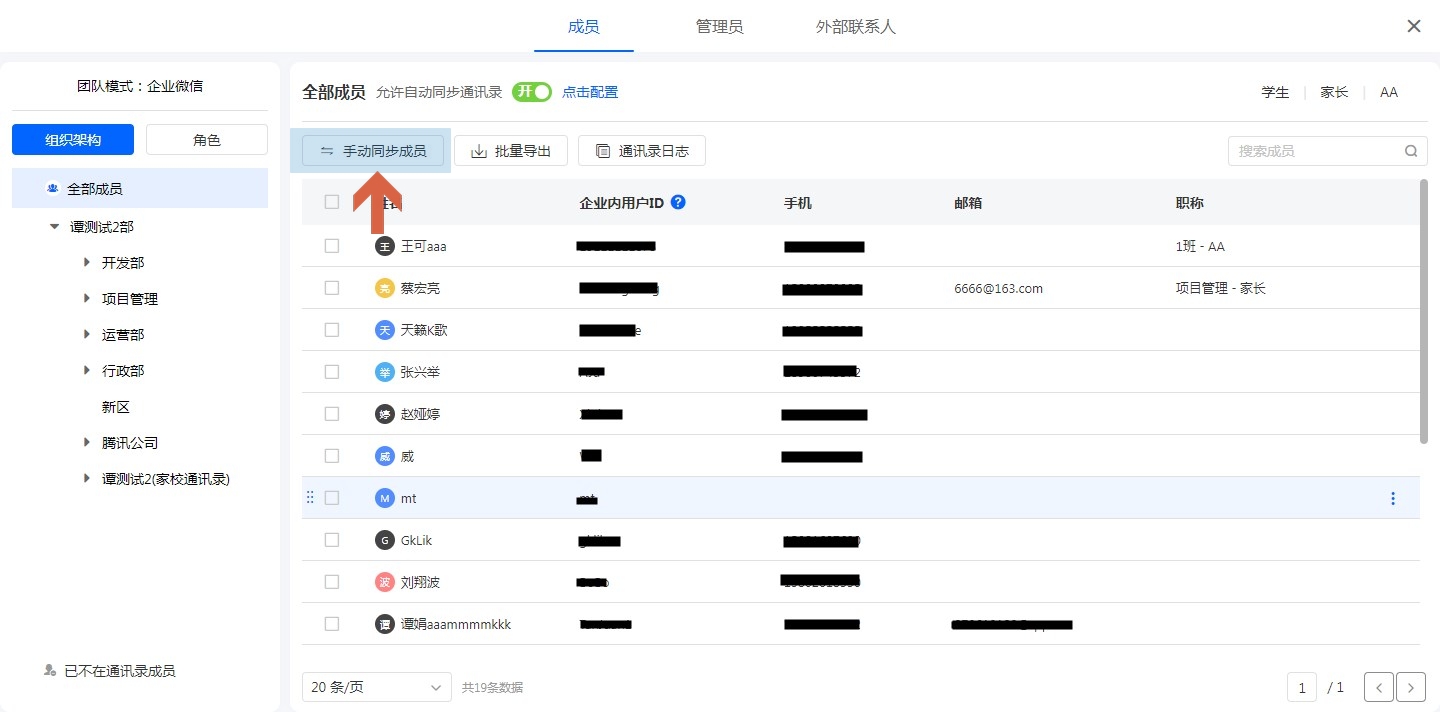 当团队组织架构或成员信息发生变化后,点击手动同步成员按钮进行组织架构的同步操作。