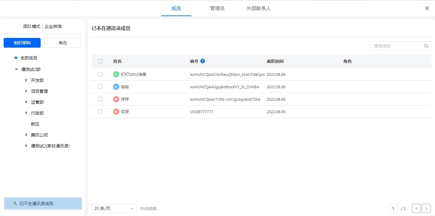 - 在企业微信后台批量将成员由不可见部门设置为可见部门时,自动同步通讯录后,可能会超过系统成员数量限制,导致系统功能无法使用,此时需手动移除多余数量的成员。
