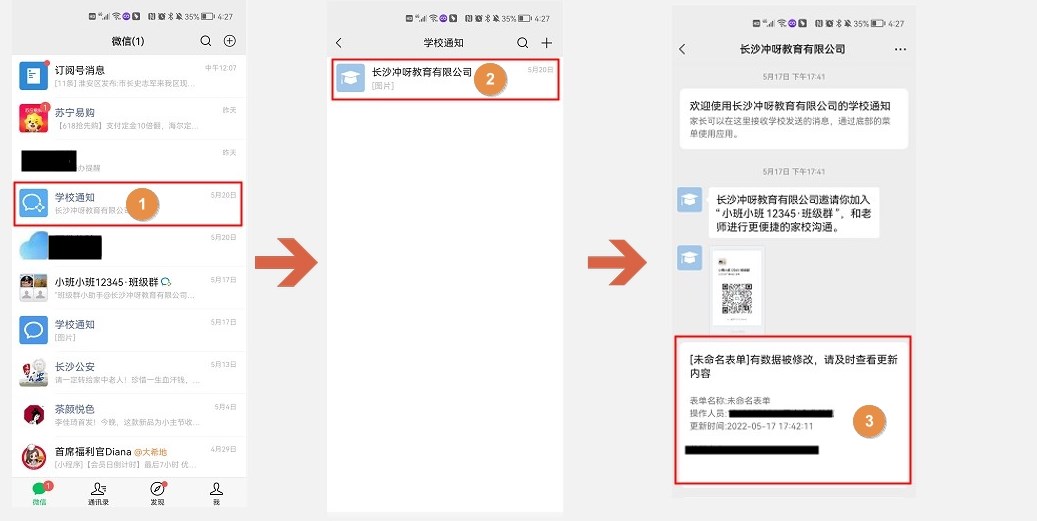 3、内部通讯录消息企业微信收到,家校通讯录消息微信收到。如下图,家长收到数据修改消息。