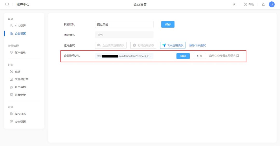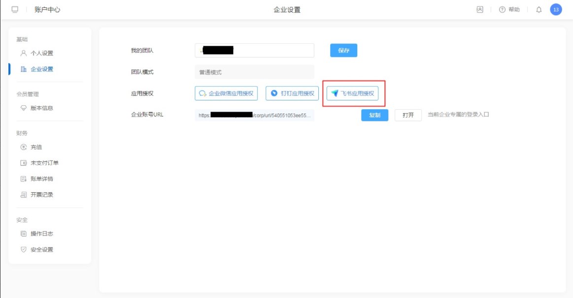 易用云账号登录系统后,进入【右侧头像】-【账号中心】-【企业设置】,在企业设置中可以进行飞书应用授权。
