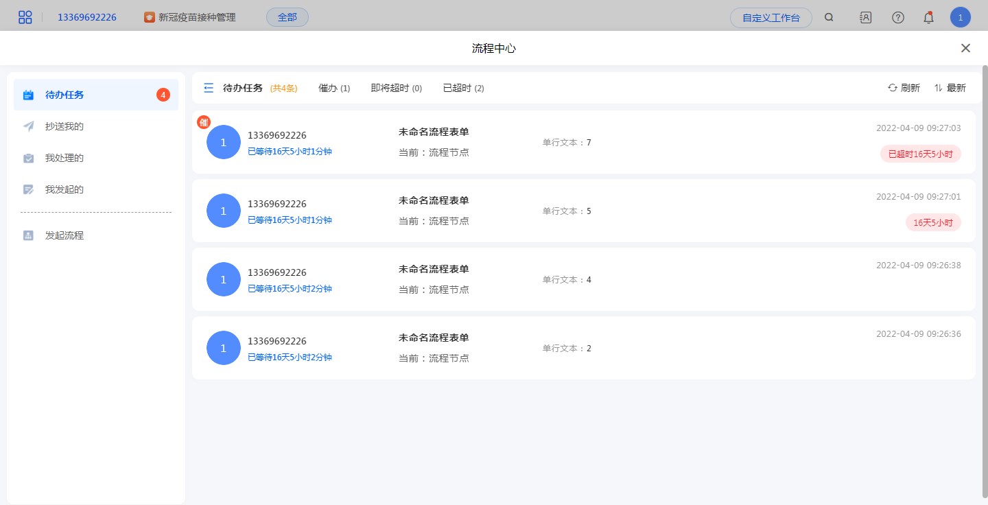待办任务下还统计了所有催办、即将超时、已超时的流程,方便快速处理。