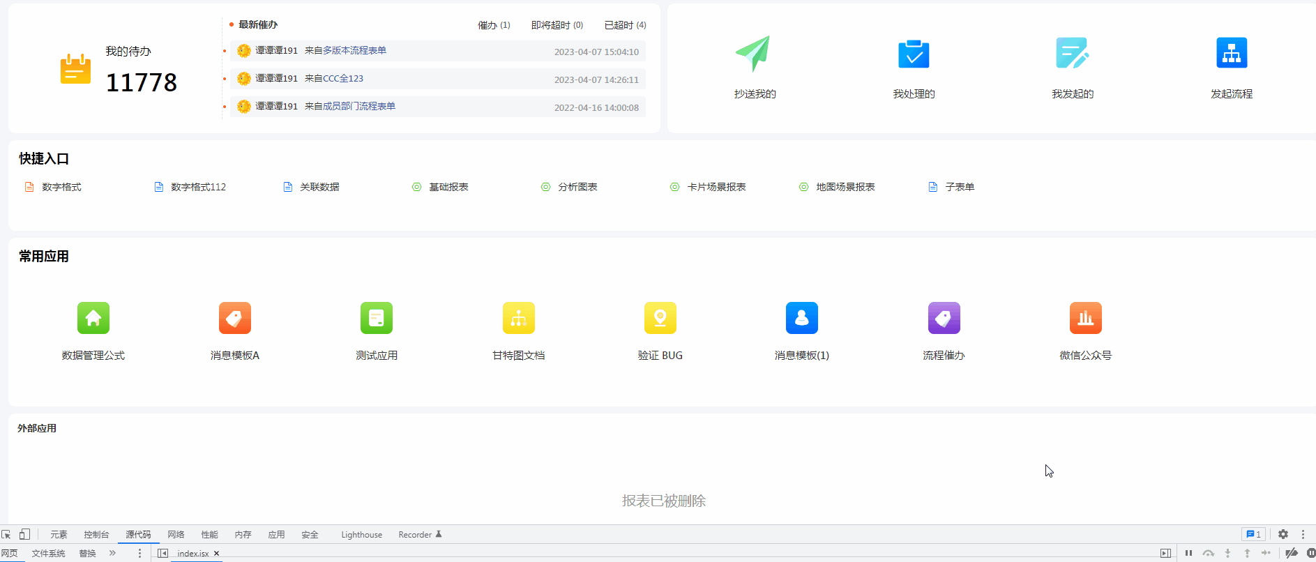 进入应用内部访问页面,可以查看此应用的待处理的任务、个人发起的任务、个人已处理的任务以及抄送给个人的相关任务,详见:流程使用。