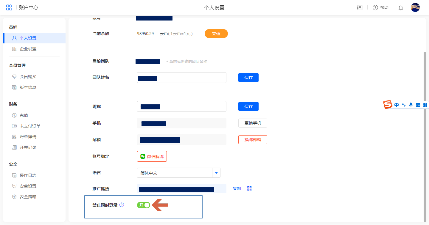 开启入口:账户中心 >> 个人设置 >>禁止同时登录