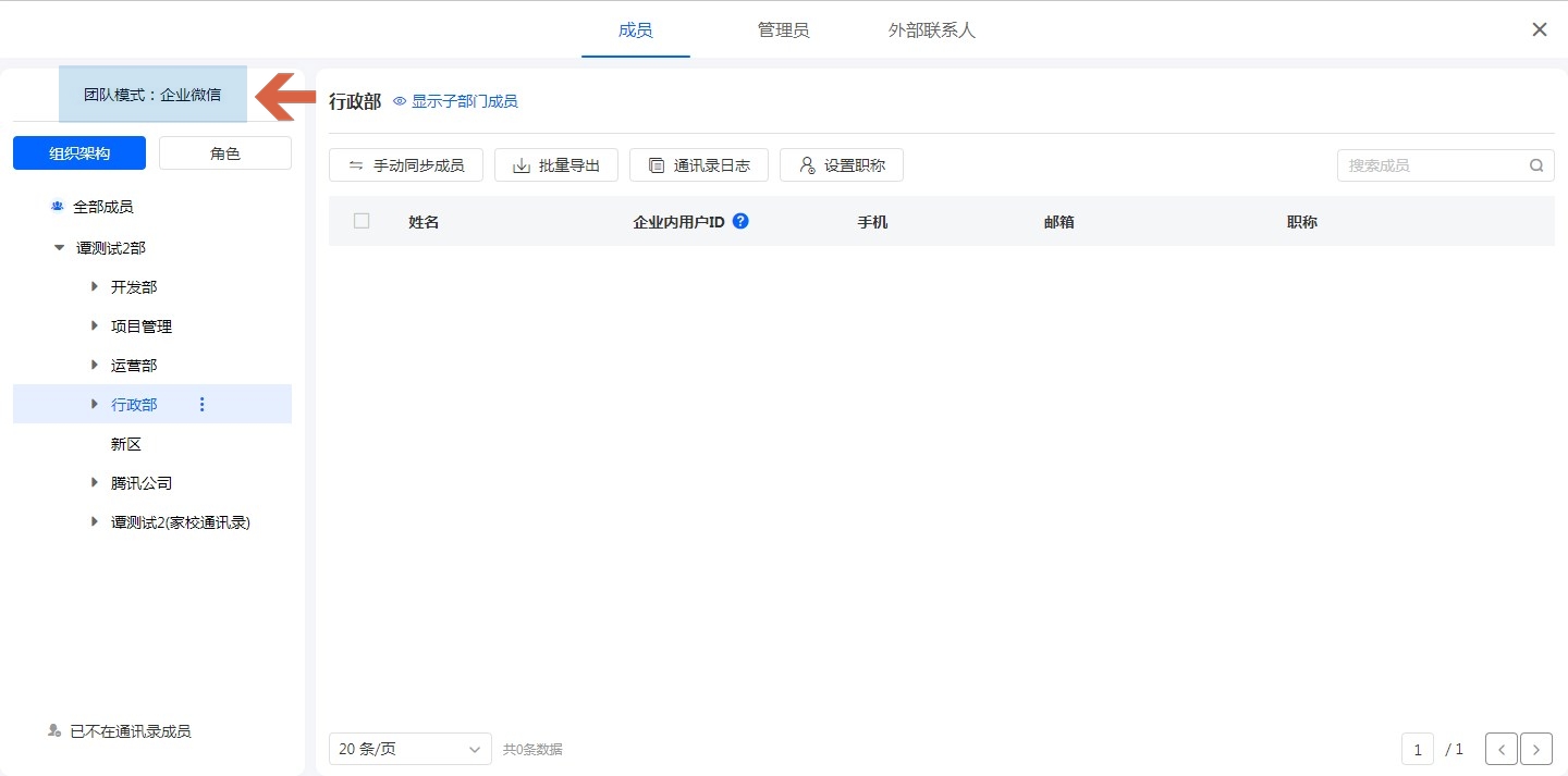 如果是易用云账号的形式的团队则是普通模式,如果是企业微信/钉钉模式/飞书模式的团队,则需要在企业微信/钉钉/飞书管理后台同步组织架构。
