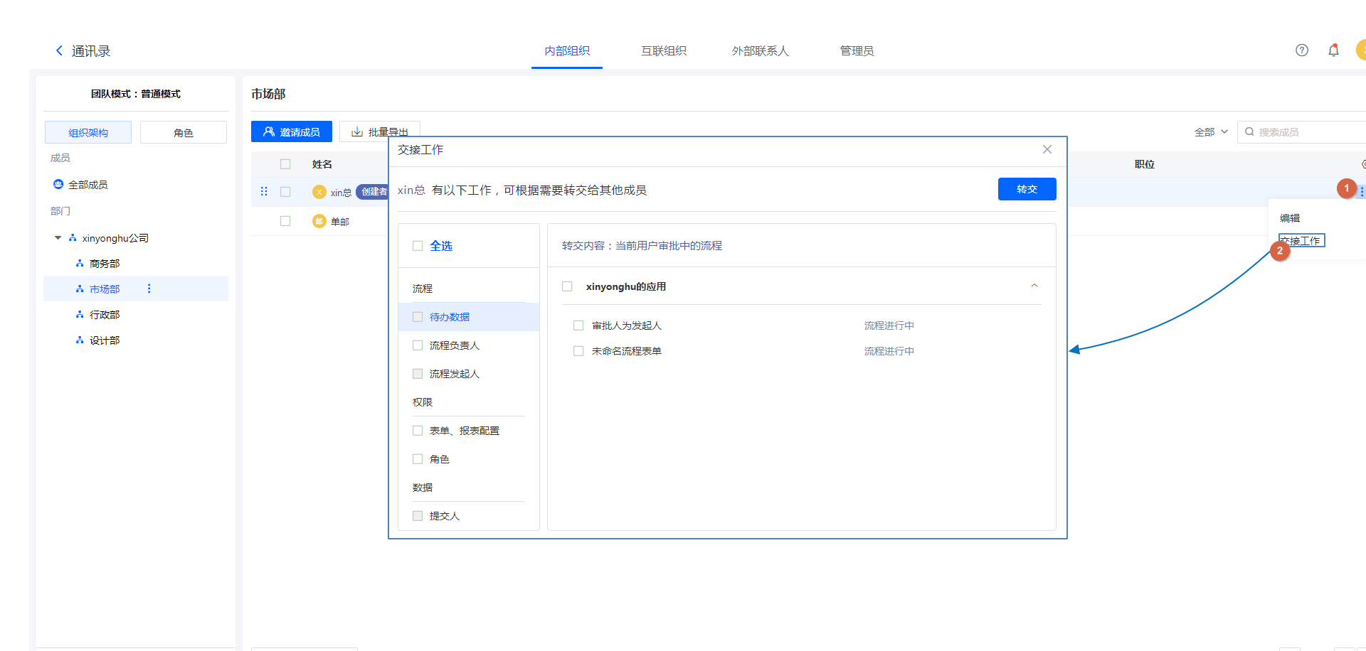 注意:交接提交人,如果是流程表单,那么只交接提交人,不会交接流程发起人;如果需要交接流程发起人,在流程-流程发起人下进行交接。