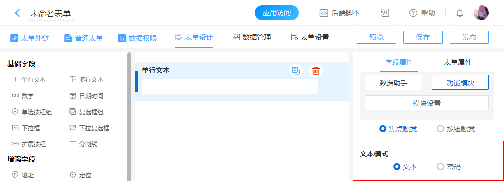 文本和密码只能选择其中一种,选择文本则输入内容可见,选择密码则输入内容以密码样式显示,内容不可见。