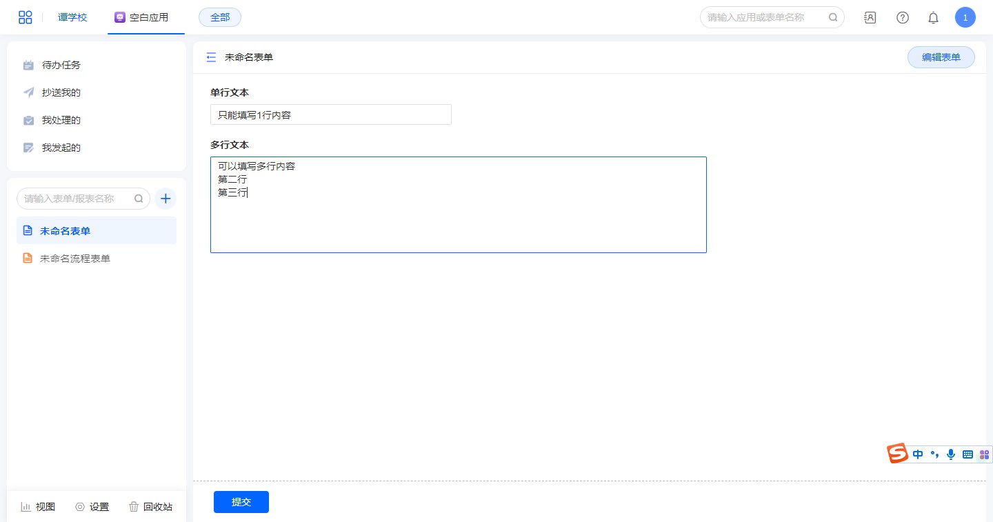 “多行文本”用于表单中录入多行数据的场景,可以填写多行文本,支持换行填写。