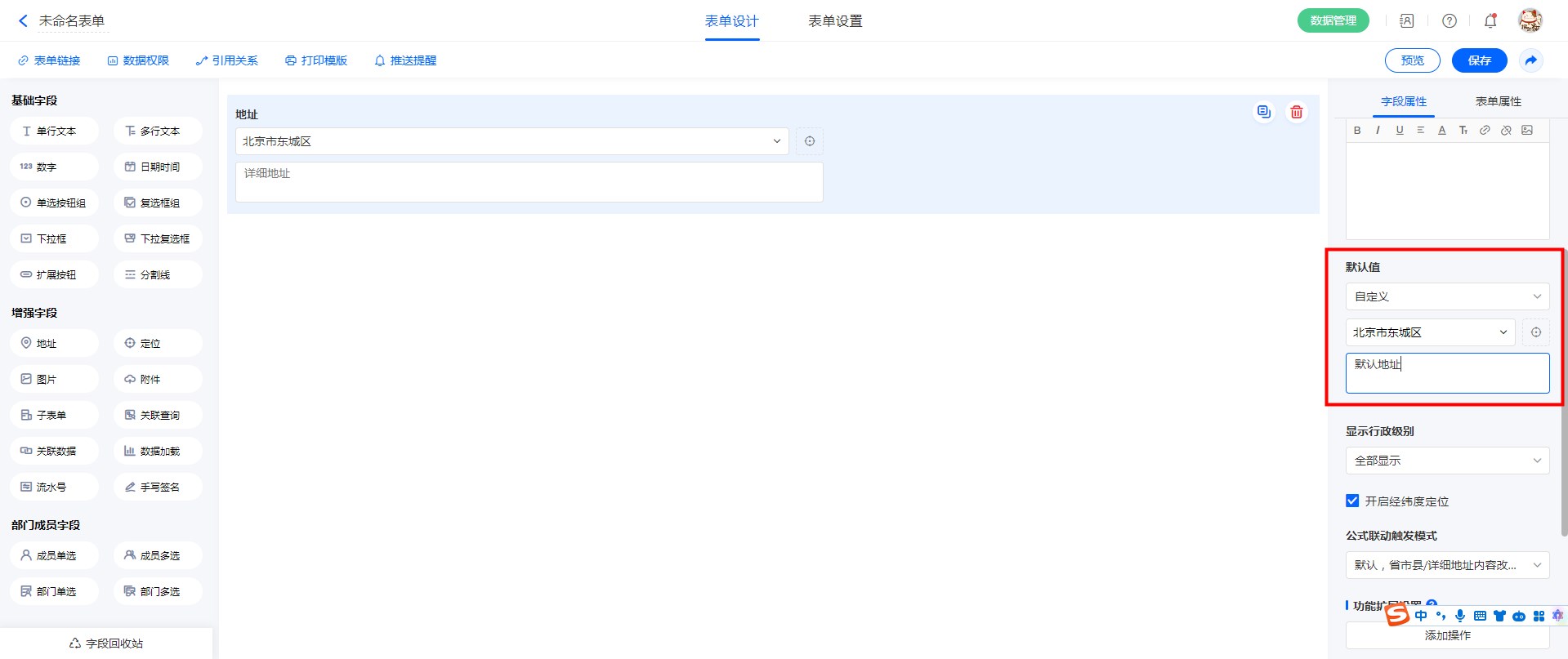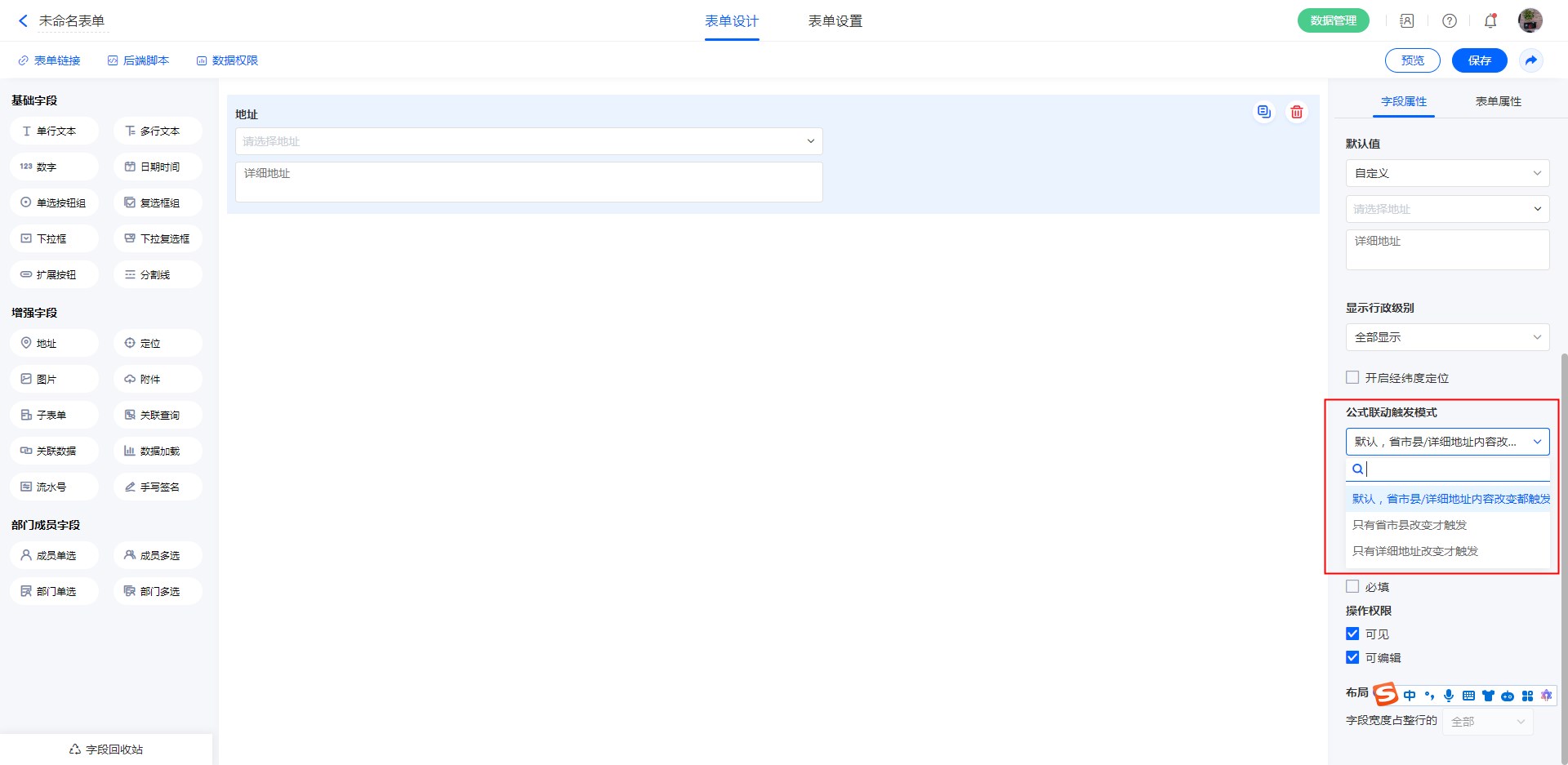 | 设置入口:表单设计-地址字段-公式联动触发模式 |
