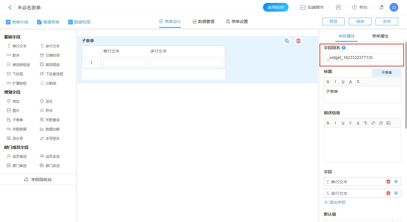 字段别名用于后端开发,默认为系统自动生成的随机字符串,实际使用中可修改,但需遵循如下原则: