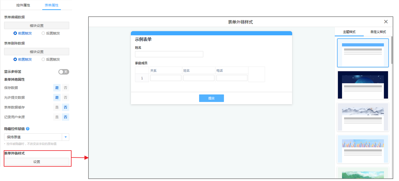 表单外链的样式分为主题样式和自定义样式,主题样式即易用云内置的样式模板我们选择就可使用。自定义样式即由自己自定义设置。