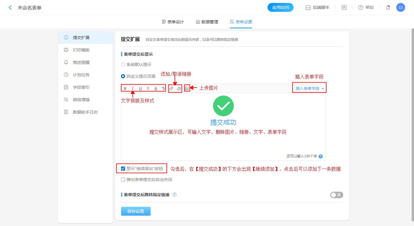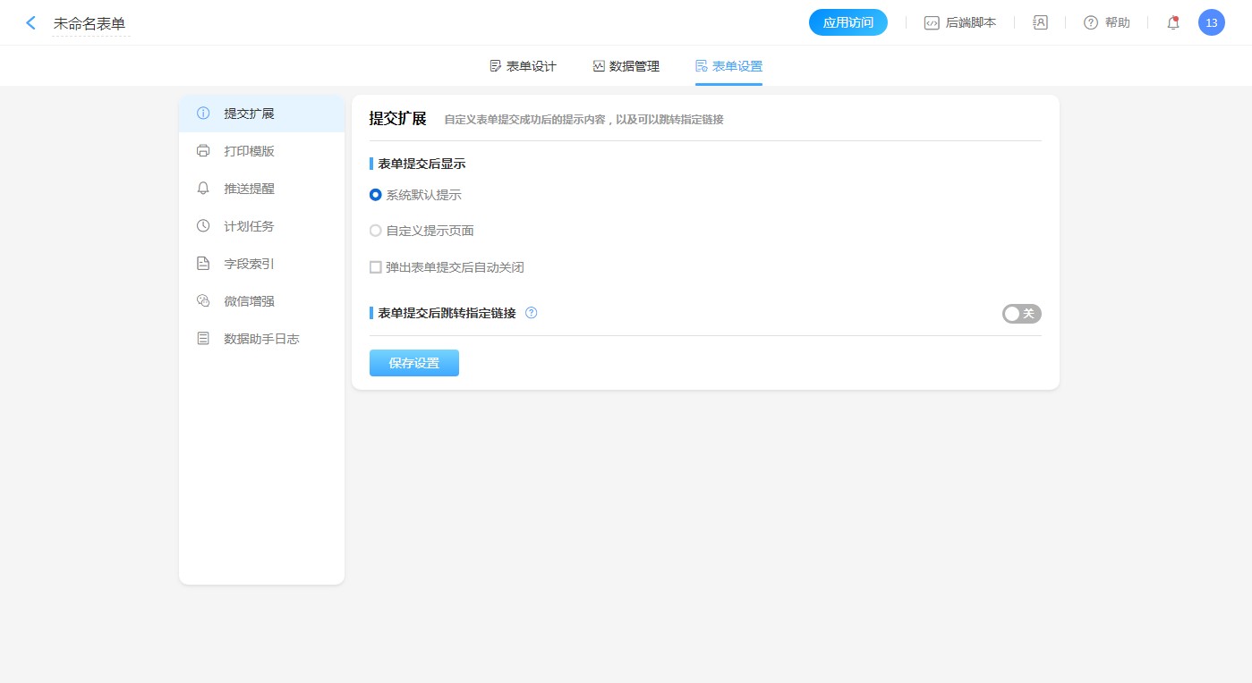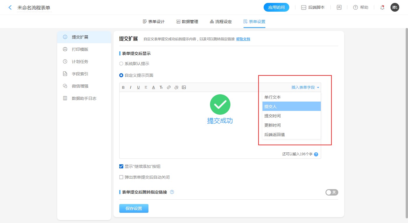 关闭表单提交后跳转指定链接后,提交数据后会进入提交成功提示页面。