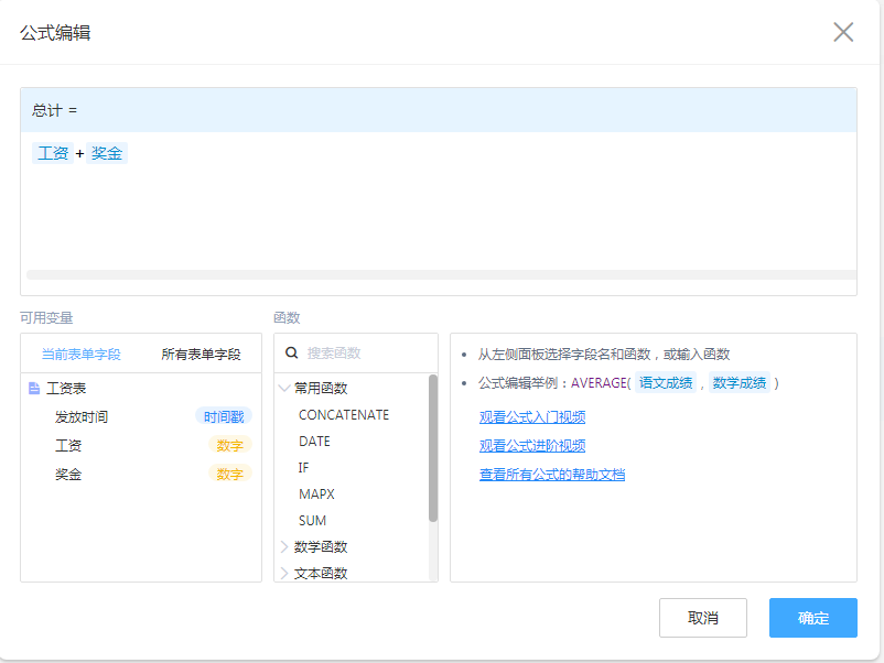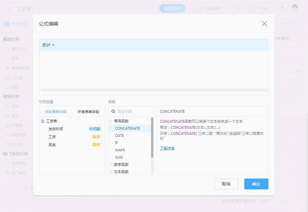 - 注意: 所有的控件,都有一个内置的ID,而所能看见的控件名称,也仅仅是一个名称,所以当公式需要将控件值作为变量的时候,手动输入或复制粘贴都是无效的,因为字段名可以重复。如果需要将这个字段(控件)引入计算,需要手动点击左侧的字段列表。