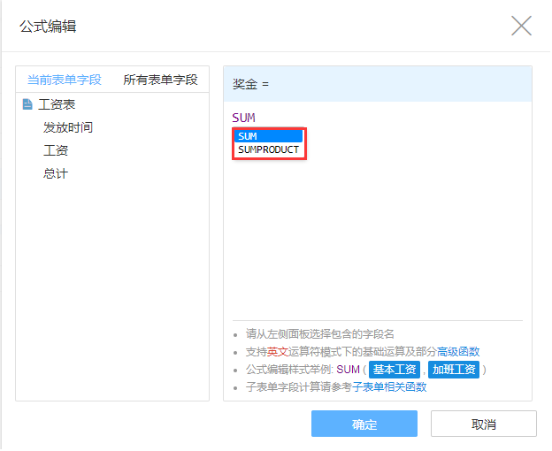 公式面板下方可以选择公式所要用到的字段。一定要从下方选择字段(蓝底),手写或者复制无效。除了MAPX函数之外,其他函数的字段都必须来自当前表单字段。