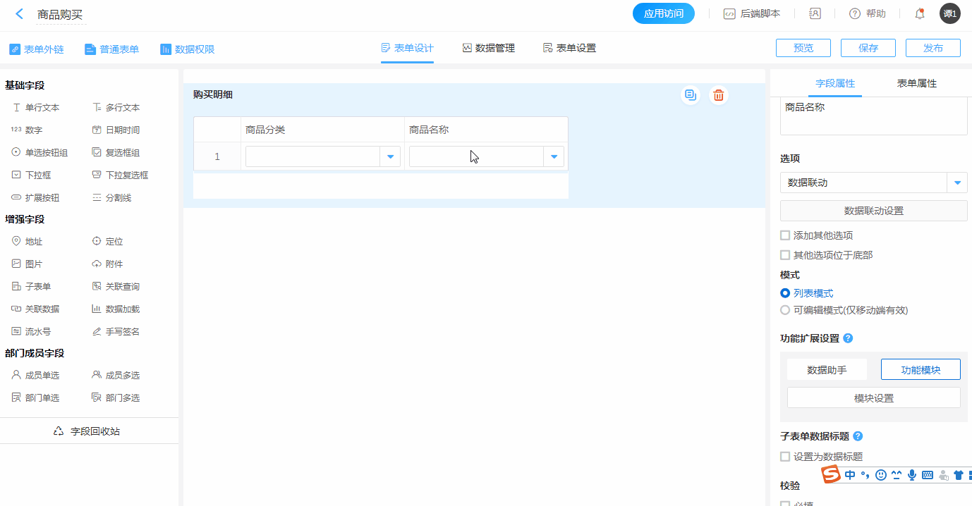 3、一级联动:【子表单】控件属性“字段”添加1个【下拉框】字段,标题为:商品名称,数据联动到表单【商品信息】里的"商品名称"。