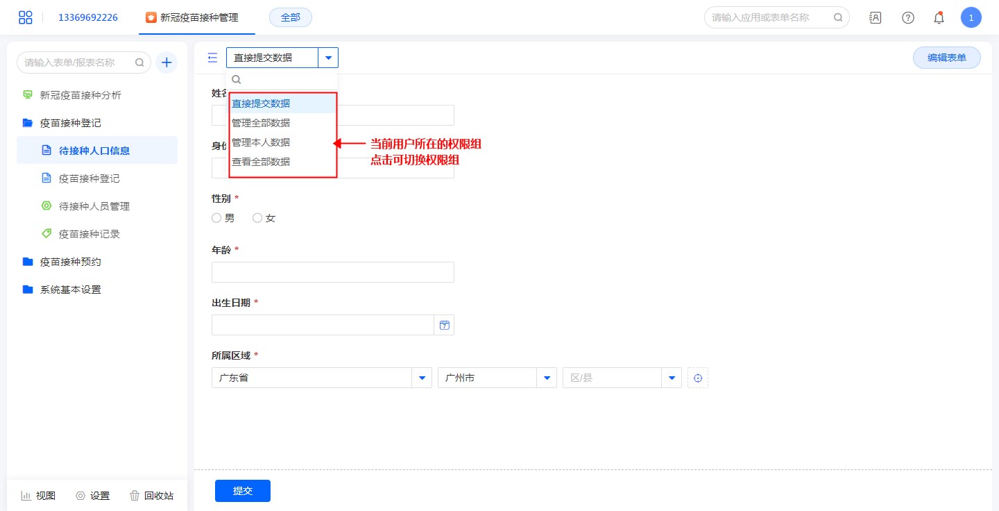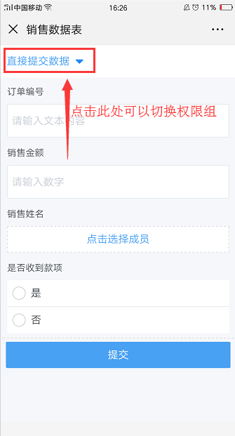 - 进入表单,右上角显示为当前权限组(自己的昵称下方),存在多个权限组的话可以进行切换。